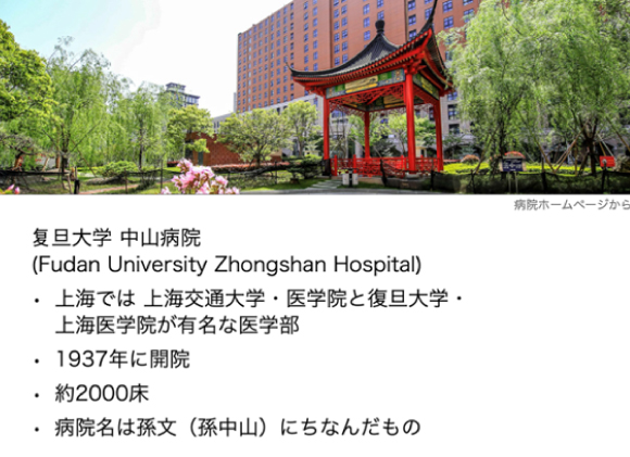 上海では,上海交通大学と復旦大学の医学部が有名で,病院もそれらの附属病院が大きく歴史ある病院として有名です。病院名の中山とは孫文の日本名に由来し,中国にはこの「中山」という名前がついた施設が多く存在します。意外なところに日本との繋がりがあるものです。
