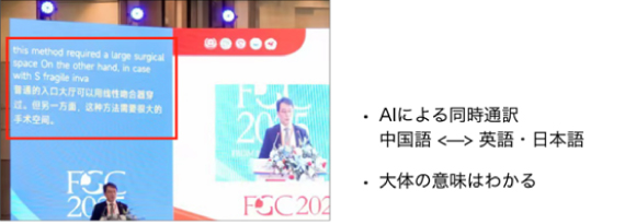 私の講演は10月25日の朝でした。つたない英語での発表です。一見普通の会なんですが,なんとAIによる同時通訳が大きなスクリーンの両端に表示されていました。今回は,私が唯一,中国語を話せない人間なので,中国語を日本語に,私の英語を中国語に,ほぼタイムラグなしに翻訳していました。機会翻訳なのでもちろん間違いはあるのですが,スライドを見ていれば大体のことはわかります。初めての経験でしたが,今後,国際会議でのやりとりが変わるかも知れないと強く感じました。